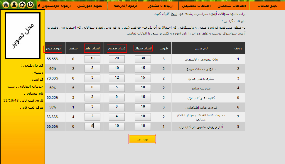 ۲. محاسبه درصد هر درس با توجه به پاسخ های صحیح و غلط و کلیک بر روی بررسی